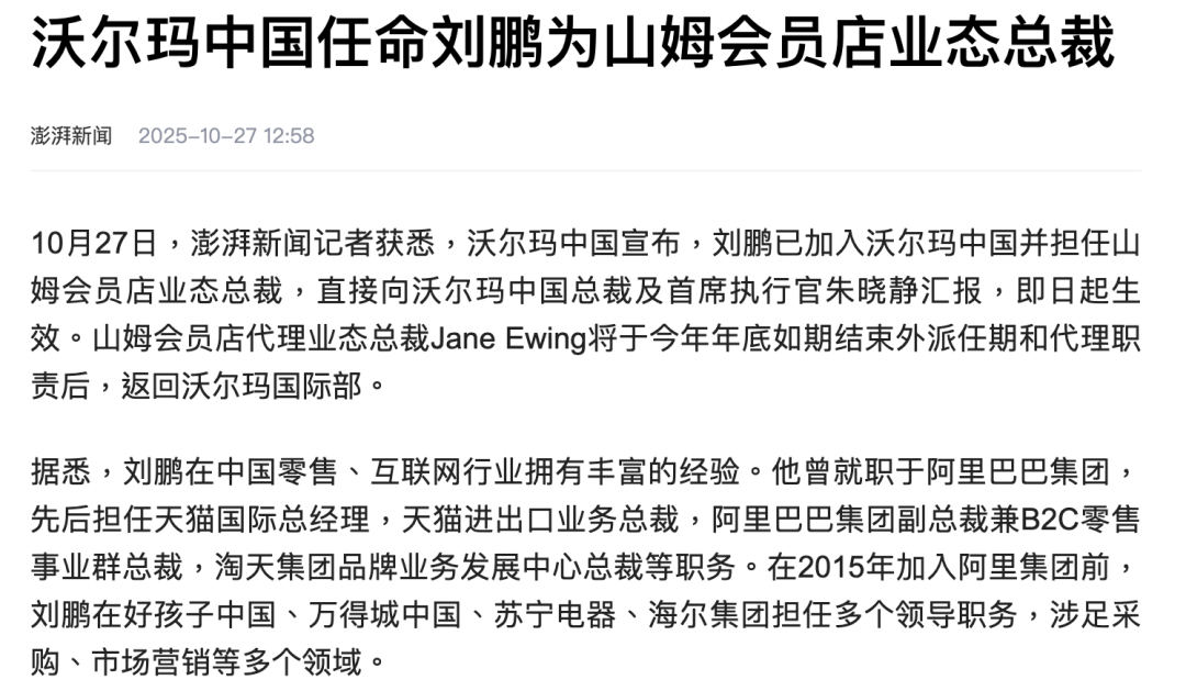 10月27日,沃尔玛中国宣布任命阿里巴巴原高管刘鹏出任山姆中国区总裁。