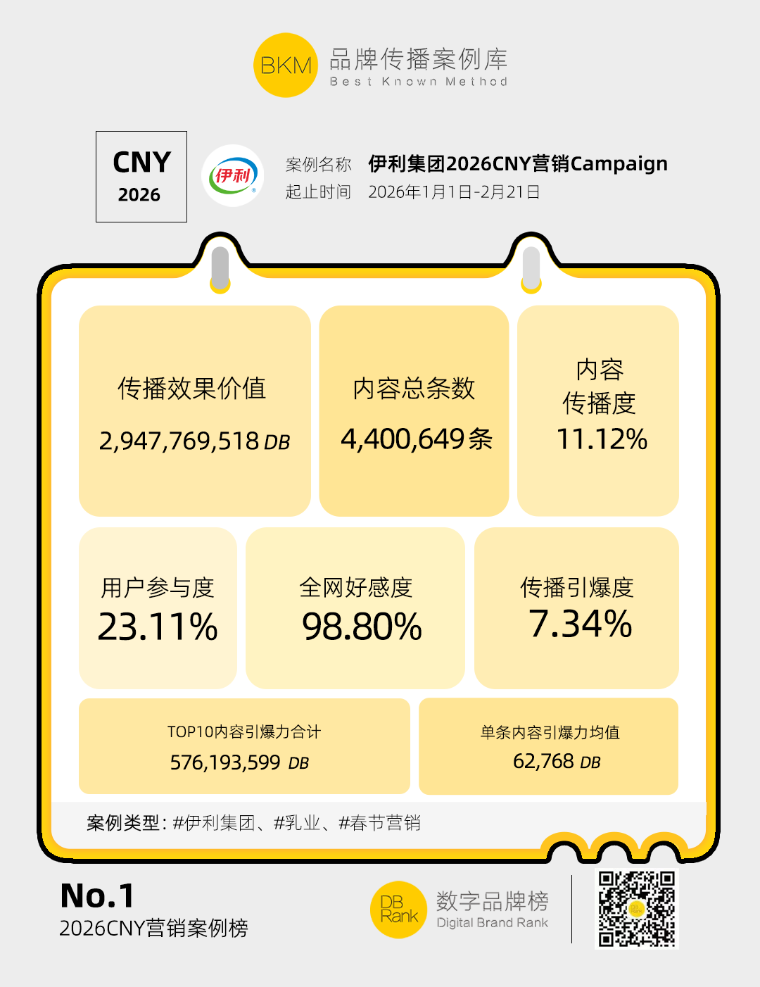 在『数字品牌榜』此次发布的2026CNY营销案例榜上,伊利集团以29.48亿DB的整体营销战果,获得春节期间10.16%的用户心智占有率,排名第一。在榜女郎看来,伊利的制胜心法有三点: