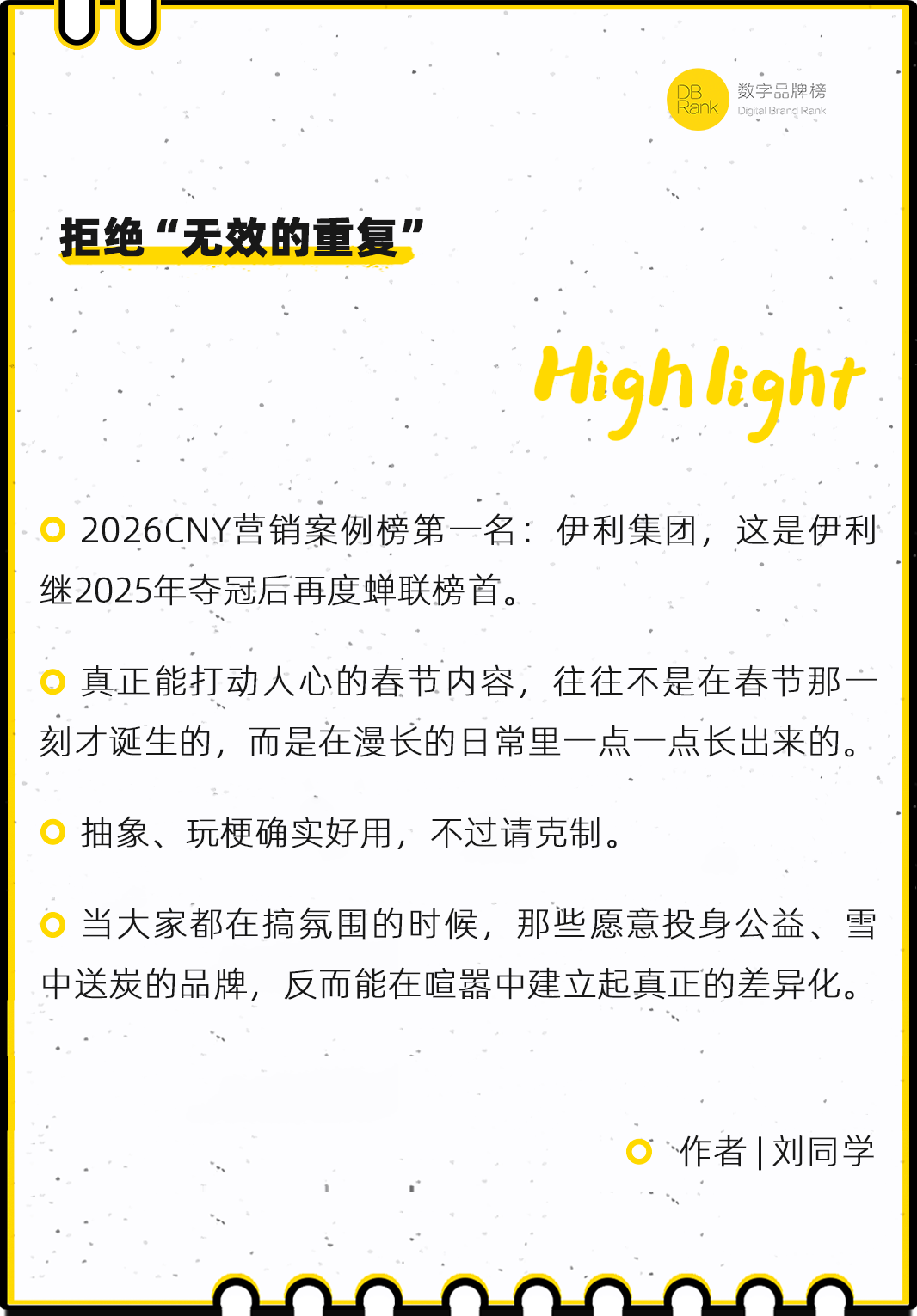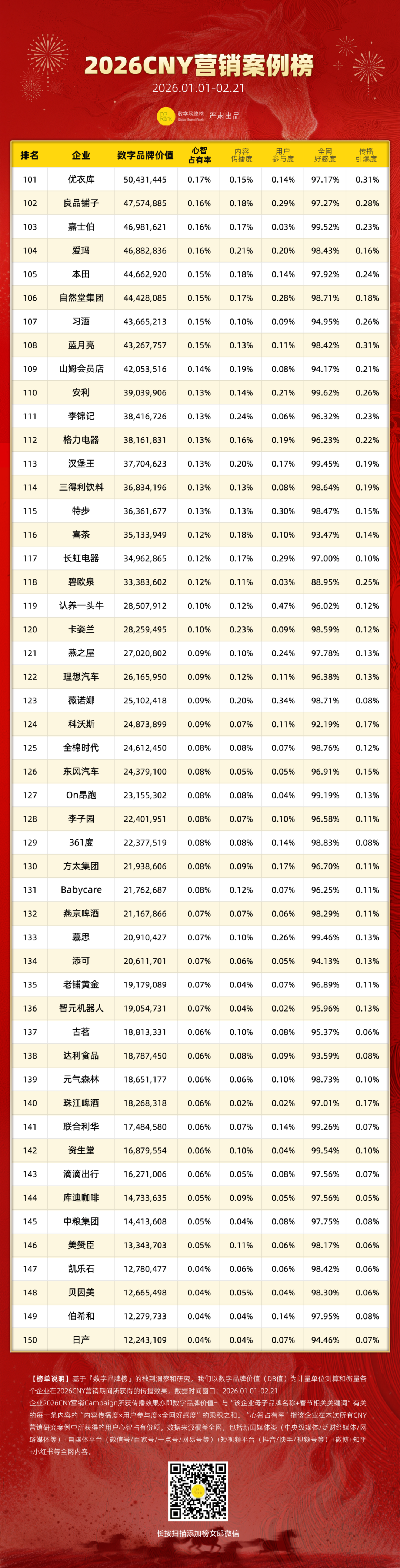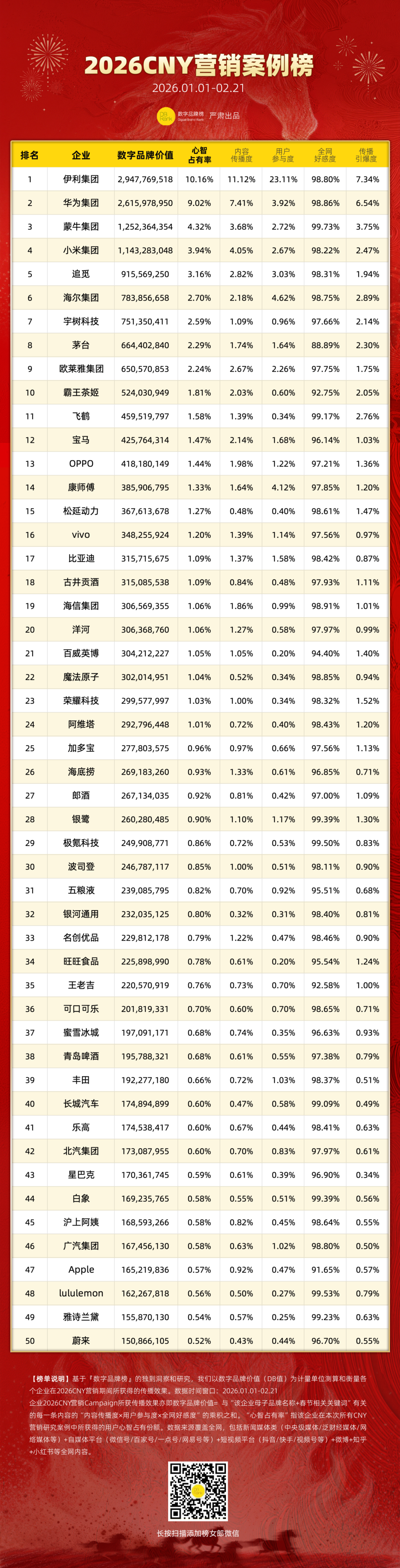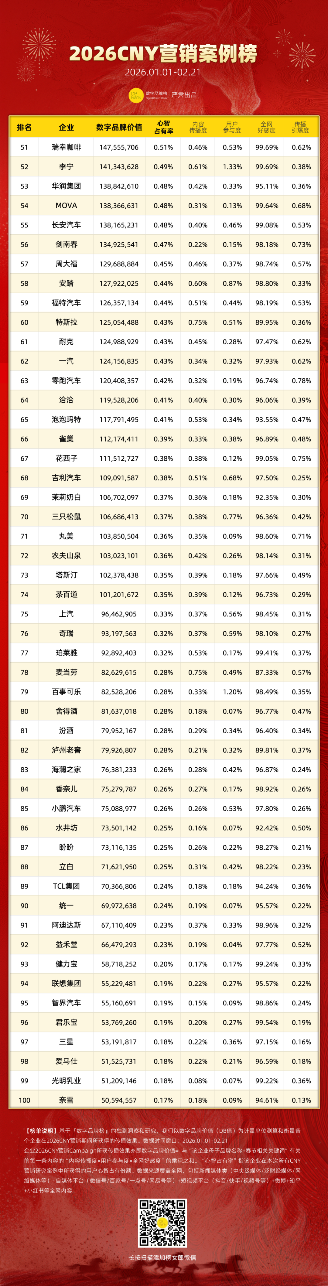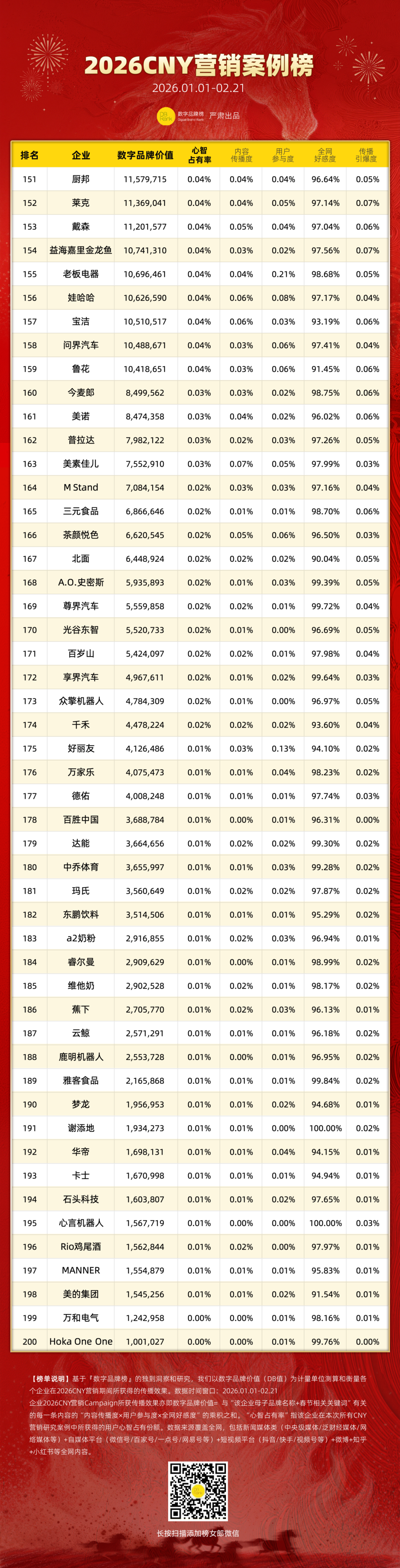 以2026年1月1日-2月21日为监测窗口,『数字品牌榜』对数百个品牌的春节营销效果进行研究,特别推出2026CNY营销案例榜TOP200。(特别说明:互联网平台类,如抖音、B站、京东、天猫等,以及AI应用类,如千问、豆包、元宝等不纳入此次排名)