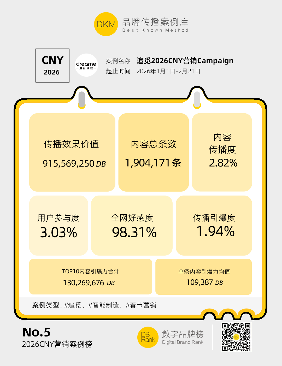 2026CNY营销中,追觅可以说是最大的一匹“黑马”。『数字品牌榜』去年发布的2025CNY营销案例榜上,追觅以22,193,786DB的数字品牌价值位列第148,而今年则以915,569,250DB的数字品牌价值位列榜单第5。
