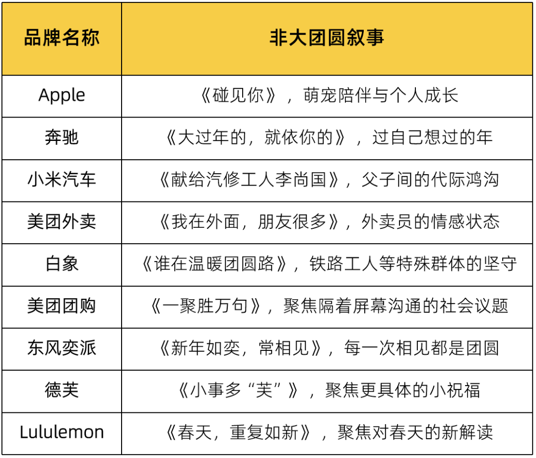 一,假洞察,或者说假装有洞察。讲团圆、讲回家,或者聚焦小众群体的过年感受,可以算作是春节大考的标准答卷,在巨大的营销投入下看似也获得了不错的声量热度,但真正去细究内容,实则煽情有余,而真情不足。可谓是被浪费的那一半预算。