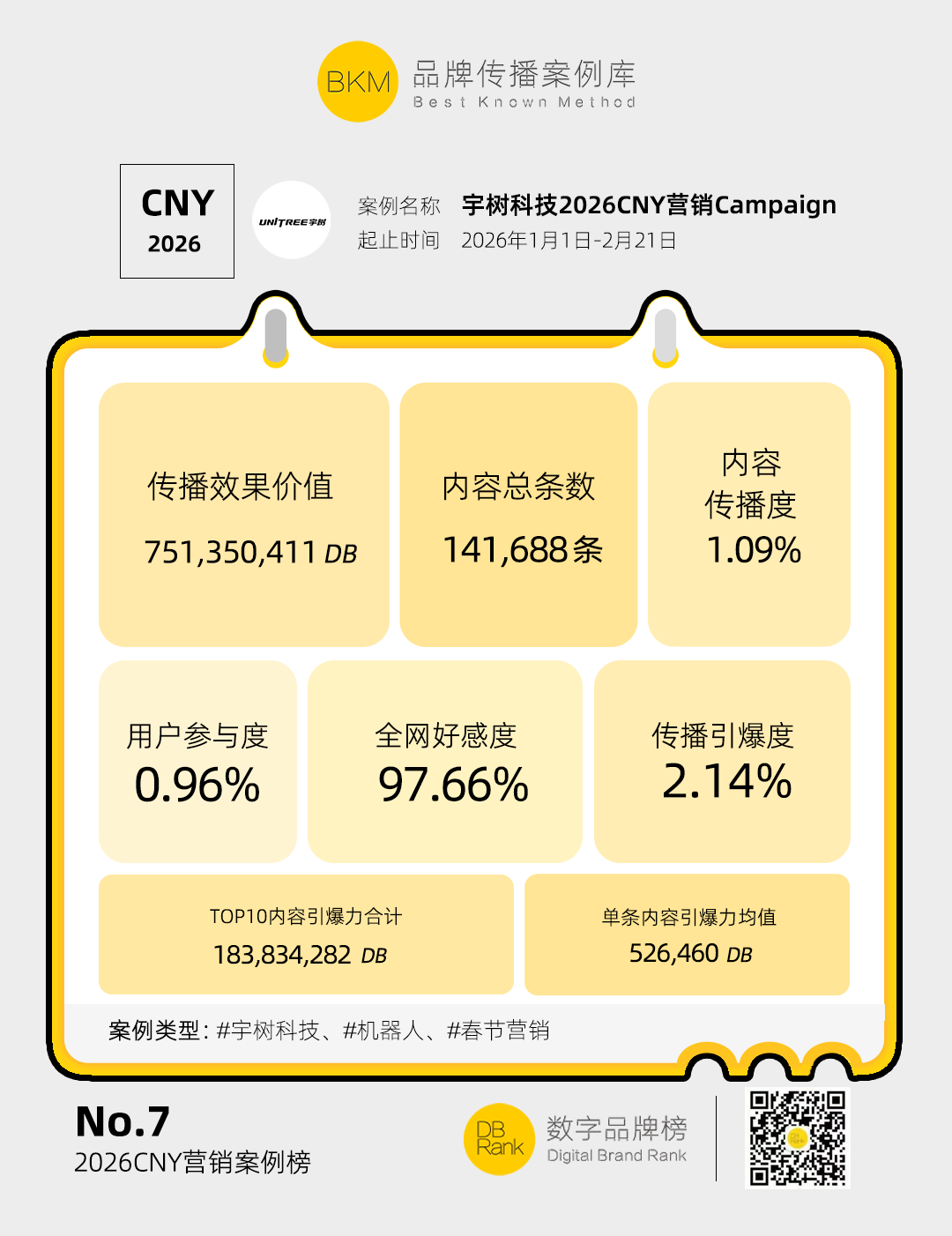 其中表现最亮眼的,当属宇树科技,在2026CNY营销案例榜上,宇树科技以7.51亿DB的整体营销战果排名第7。