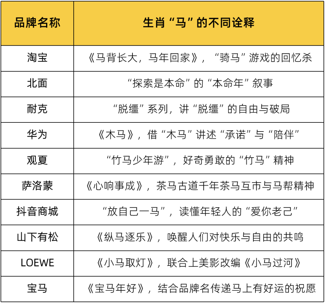 生肖确实是春节的好题材,但套公式肯定没啥好结果,真正重要的是品牌能通过生肖挖掘出哪些独属于自己的表达。那些表现还不错的马年案例,往往跳出了“马年就要讲马”的思维定式,透过马,他们看到了脱缰的自由、竹马的童真、茶马古道的坚韧等。