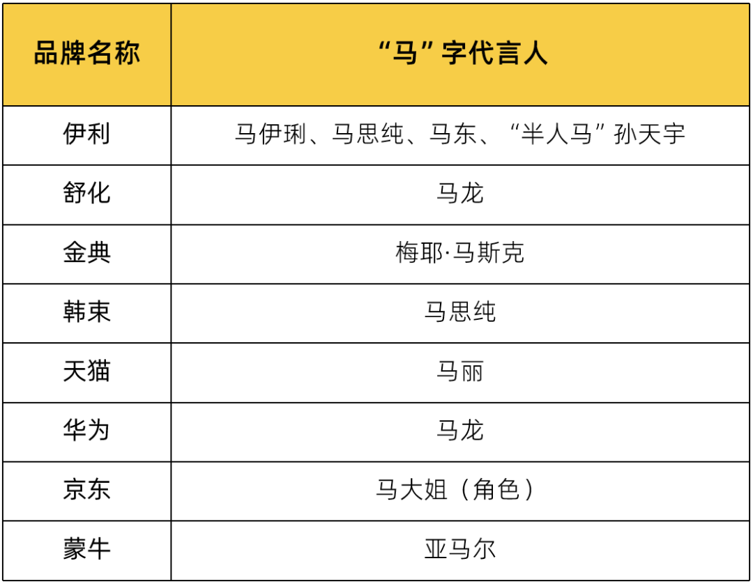 2026CNY营销,名字中带“马”的名人成了品牌们争抢的稀缺资源,不仅马伊琍、马思纯、马丽这些热门明星商务不断,演过马大姐的蔡明、扮演过“半人马”的孙天宇也成了品牌的创意源泉,金典甚至请来了国际名人梅耶·马斯克。