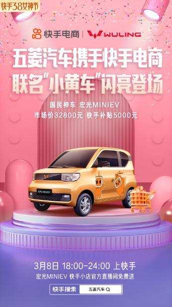 3月8日,快手电商与五菱汽车达成合作,五菱宏光MINI EV“自在款”整车将在“3.8女神节”期间由快手达人在快手小店直接售卖。