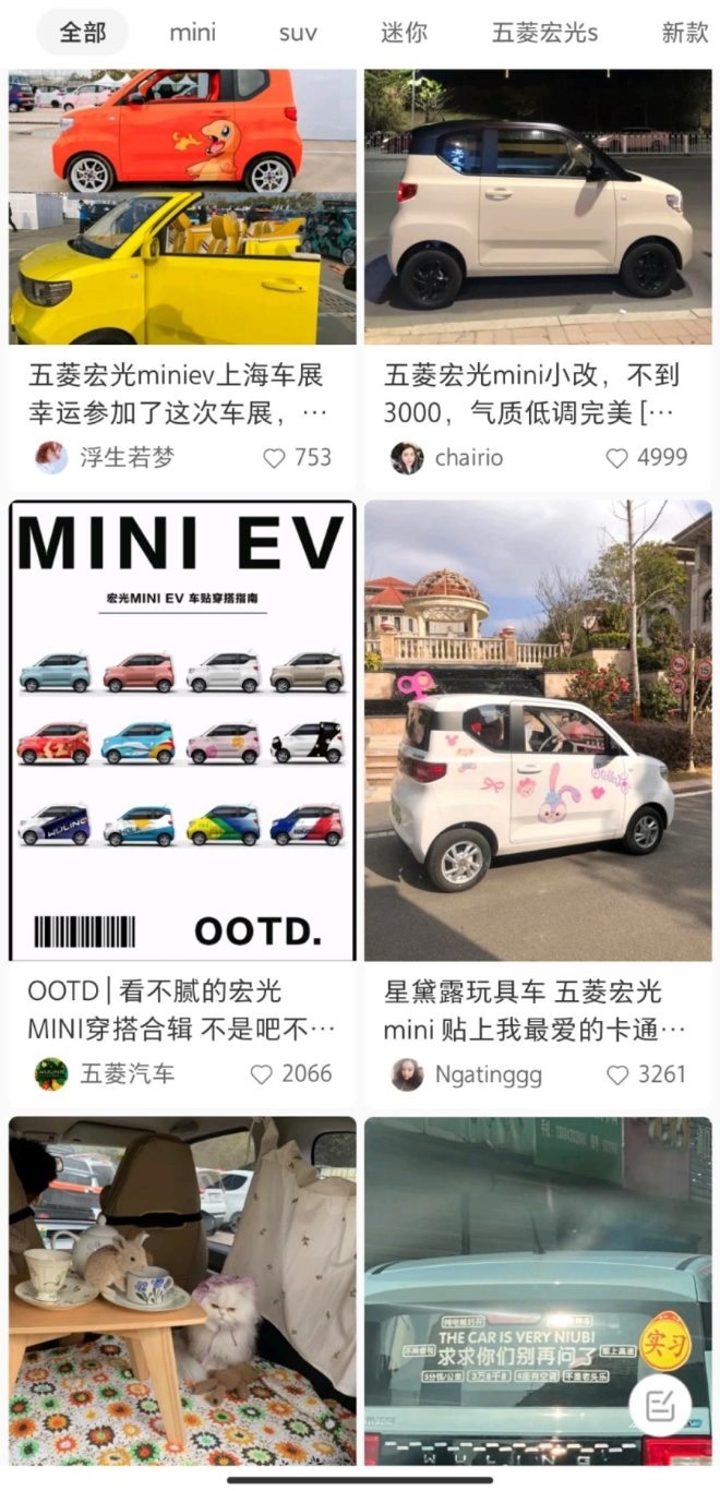 针对这款汽车,五菱汽车在营销上也是下足了功夫,不仅在快手平台开通官方账号,还在小红书发布了#五菱宏光mini ev改造话题,邀请车主进行改造并发布话题笔记,目前该话题浏览量累计1660.5万次。