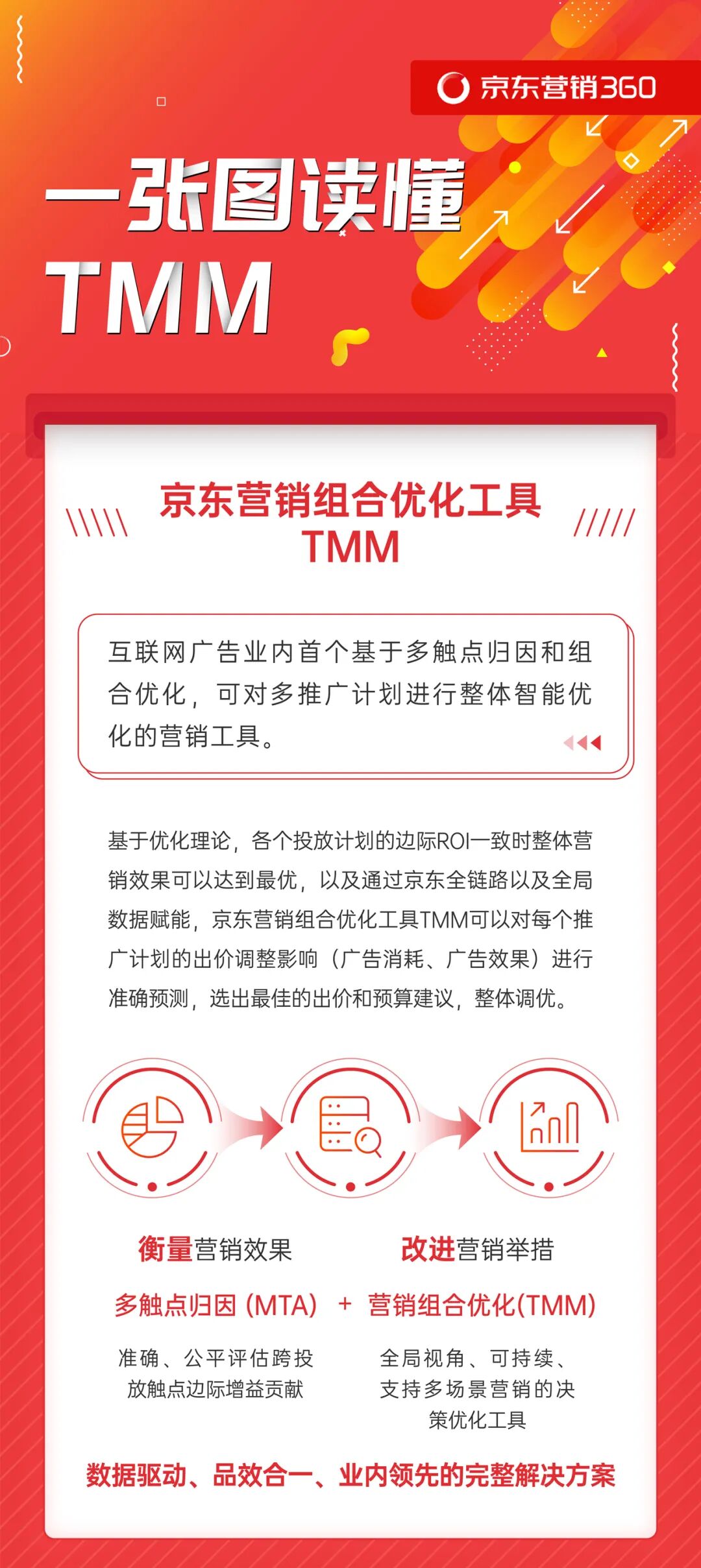 数字营销正在不断向智能化跃迁,京东多触点归因模型(MTA)与京东营销组合优化工具(TMM)相辅相成,打造了一套领先业内的完整营销解决方案,以大数据驱动品效合一的方式,实现对营销链路中各推广计划的整体动态化管理,助力品牌在技术驱动力下完成智慧决策,实现稳健而又高效的增长。