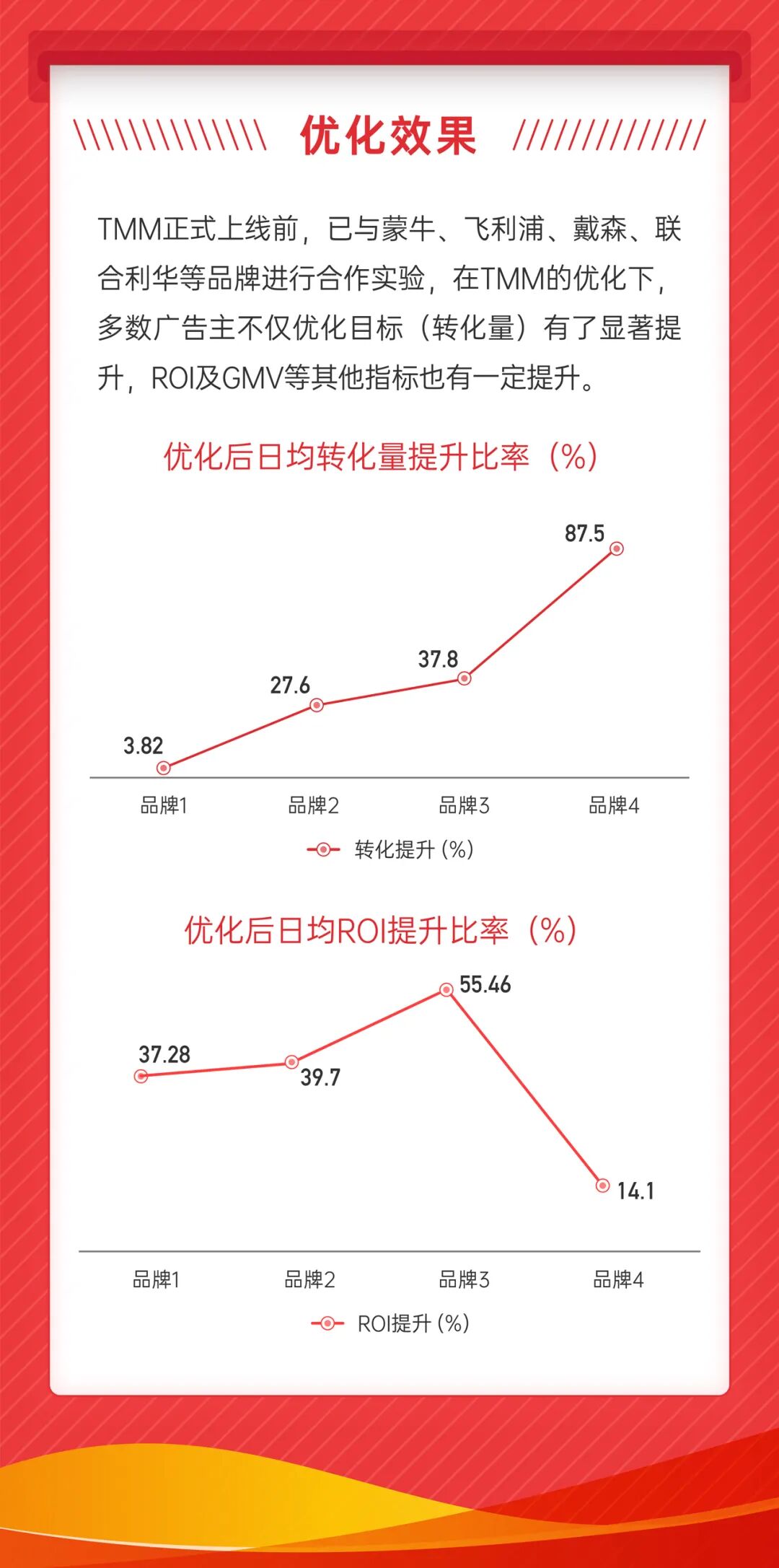 在京东营销组合优化工具TMM正式上线前,已与蒙牛、飞利浦、戴森、联合利华等品牌进行合作实验。效果数据显示,在TMM的优化下,各品牌的优化目标(转化量)均有提升,其中某品牌的日均转化量最高提升87.5%,此外,ROI及GMV等其他指标也有一定提升。