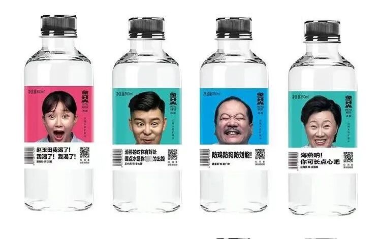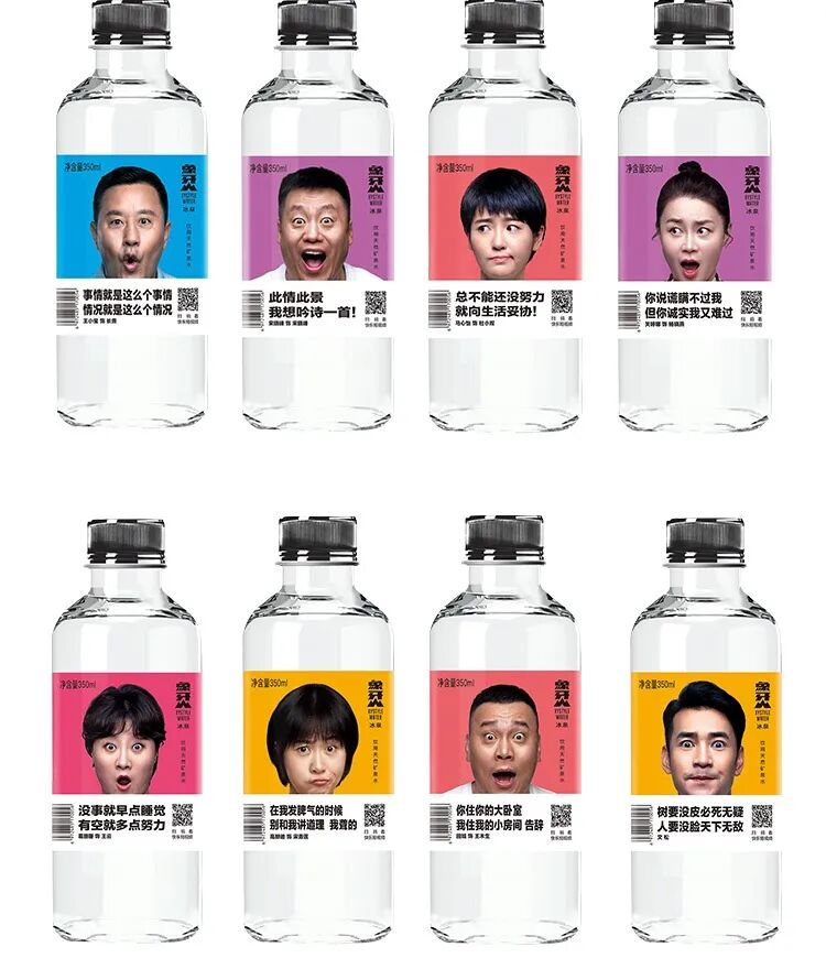早在《乡爱12》,就已推出“象牙山冰泉”,瓶身包装上印有本山系明星的头像和二维码。