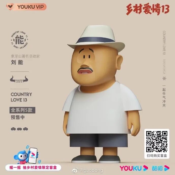 据说,优酷这次联名知名设计果冻@guodong推出的《乡爱13》“老铁盲盒”,包含赵四、谢广坤、谢大脚、宋晓峰和刘能五位,其中人气颇高的刘能款属于稀有的“隐藏款”。