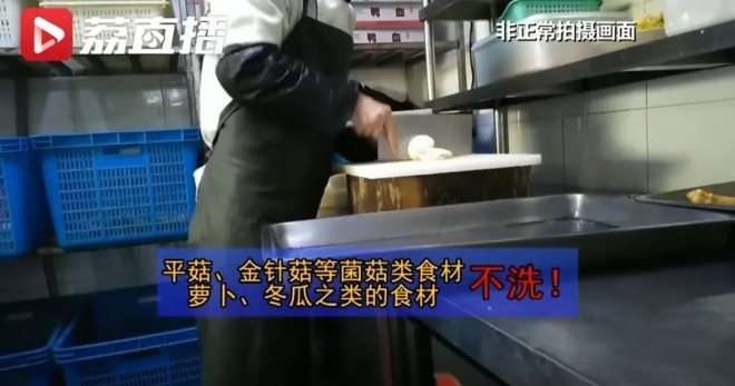 在后厨,平菇、金针菇等菌菇类食材以及萝卜、冬瓜之类的食材全都不经过清洗就上了桌。