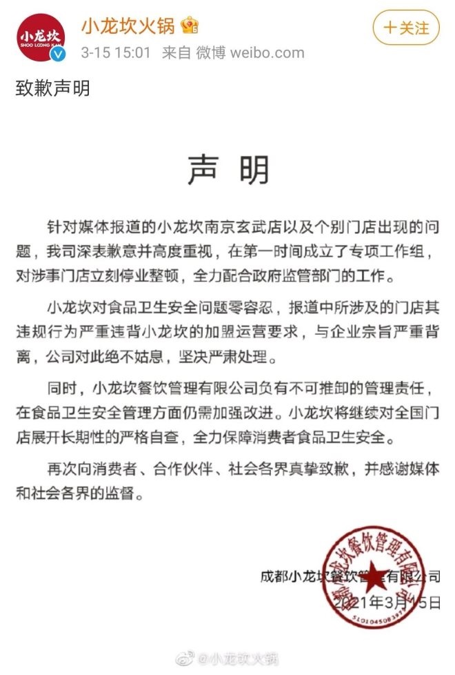食品安全问题遭曝光之后,小龙坎随即在官微发布声明致歉: