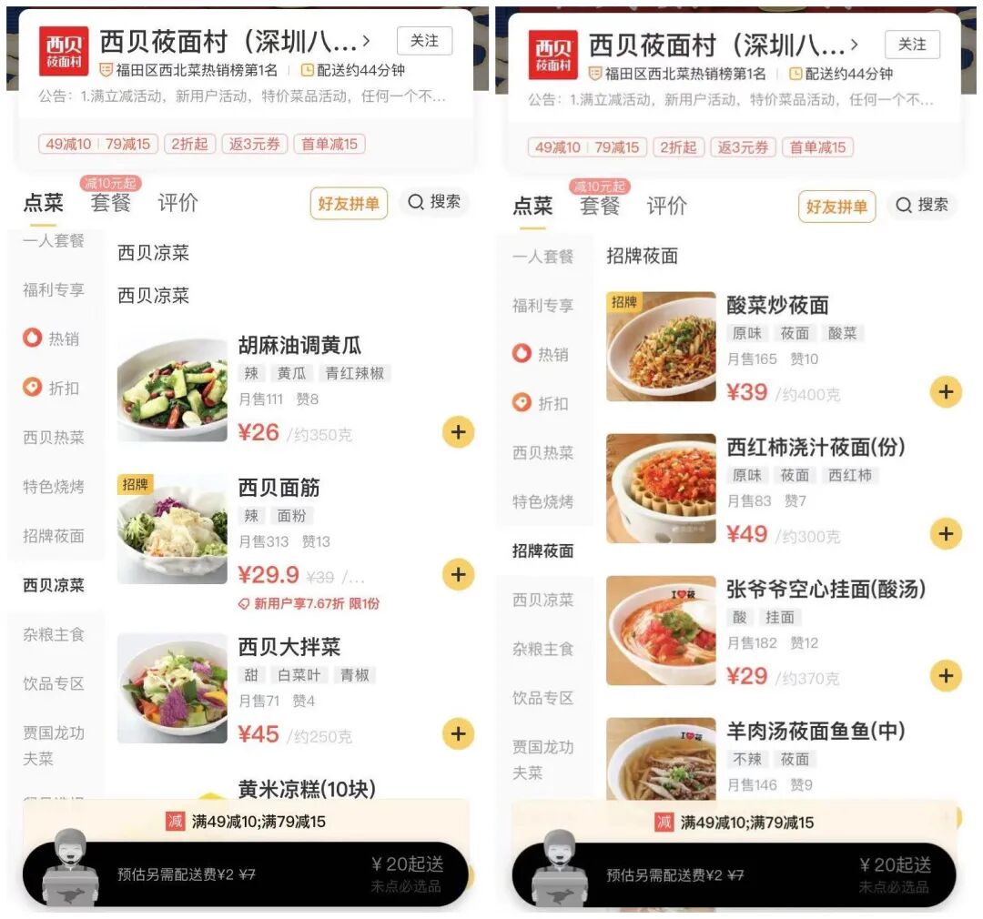 在抖音、大众点评、豆瓣、B站、百度等平台搜索“西贝”时,评论中看到最多的几乎都提到了一个字—“贵”。那么,网友眼中的贵,到底是真贵还是假贵,月薪5000以下的人究竟配不配吃西贝?以正常的午餐搭配为例,比如一份面外加一个凉菜,面最便宜的是空心挂面,一份29元,再加上“比较便宜”的拌黄瓜,一份26元,一菜一面的价格是55元。如果稍微吃个好一点的素菜,花费轻轻松松就到了七八十元。如果还想来点硬菜,吃点肉,一份500g的葱香烤鱼价格是98元,一顿饭没有百十来块钱看来很难hold住。在叠加满减和优惠折扣的情况下,一个人轻轻松松花200元吃顿外卖更不是梦!难怪有网友调侃说,这些食材都是从黄土高原空运过来的嘛!基于此,西贝的slogan “闭着眼睛点,道道都好吃”也被网友改写成了“睁大眼睛点,道道都很贵”。西北菜朴实无华,量大份足,一盆管够的优点,在西贝这里也似乎完全看不到丁点的传承。不过,值得夸赞的是,在光盘行动这事上,从下单开始西贝就拿捏的恰到好处,从来没让消费者操心,不但不让你浪费,可能还不够吃!