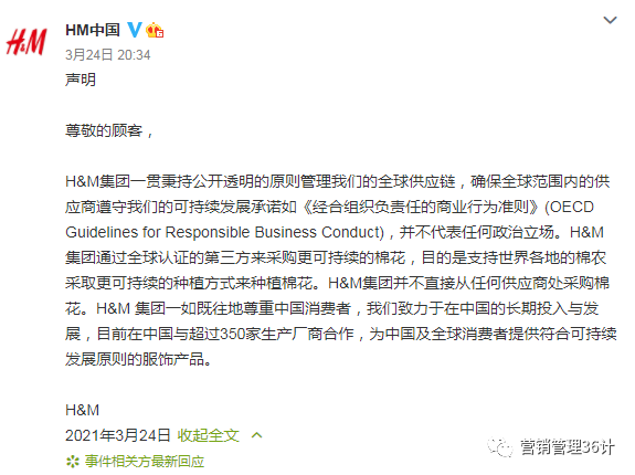简单给大家梳理一下时间线,首先是瑞典的一个快时尚品牌H&M发布了一条声明,声明中写道: