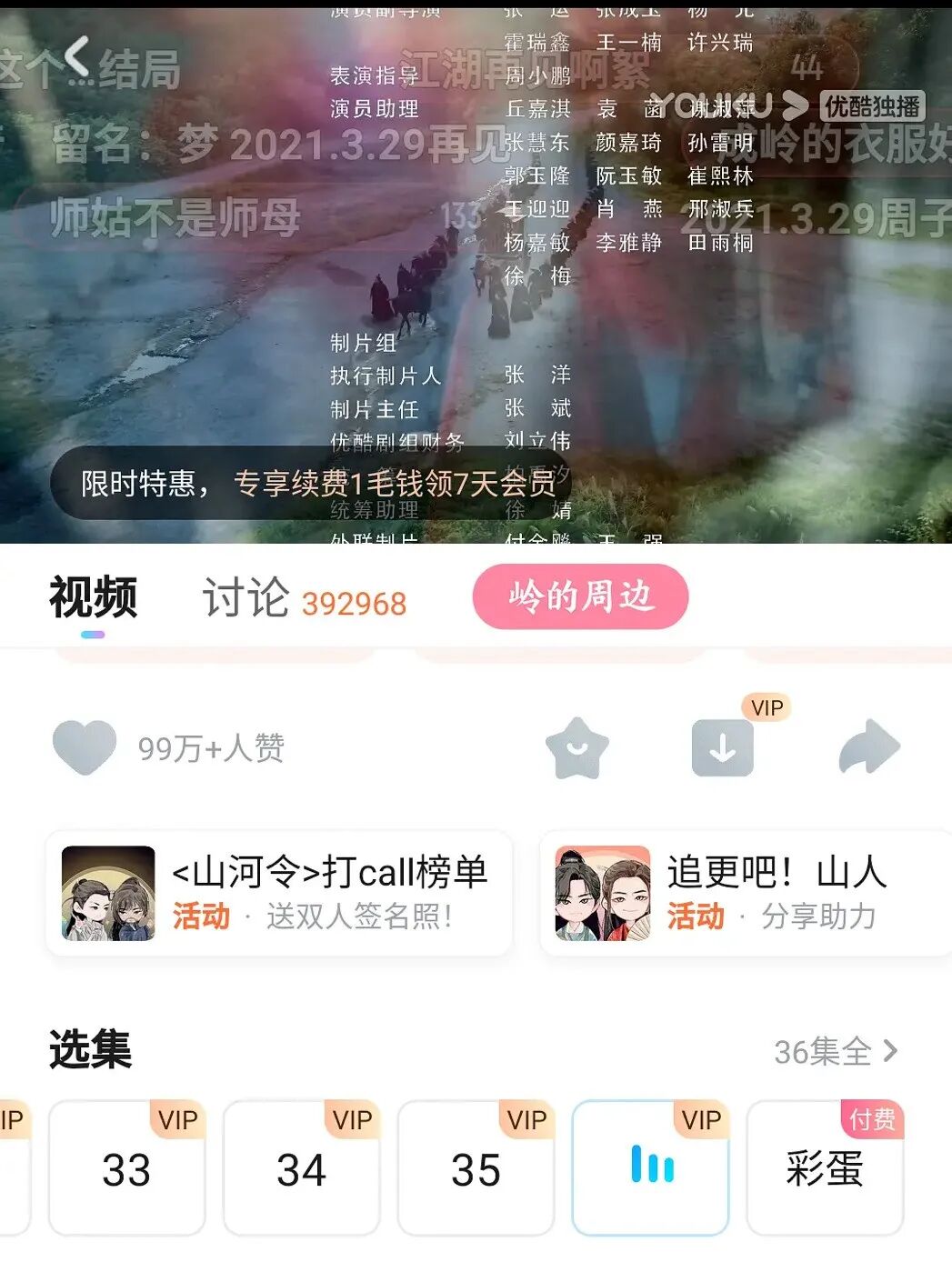 而这三块钱解锁的彩蛋里,前四分钟是主题曲MV,只有最后三分钟才是观众想看到的结局。不过,还是有很多观众为了看到大团圆结局,又花了三块钱。三块又三块,从超点到大结局,为《山河令》“上头”的观众,不知不觉间就花了整整57块钱。不得不说,对于如何“割韭菜”,优酷的套路实在太深了。