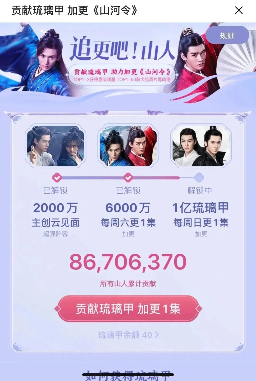 而观众获得琉璃甲的最主要方式就是氪金,即充优酷会员。一张季卡,可以获得130块琉璃甲,一张半年卡,获得260块琉璃甲,一张年卡,获得520张琉璃甲。当时这个打投加更活动一出,就有很多人骂。但是挡不住大家想要追剧的热情啊,只能一边骂优酷一边打投。甚至,还有观众直接打投了108995块琉璃甲,我粗略算了一下,是200多年的优酷VIP,这是可以让子女继承的“传家宝”哇。