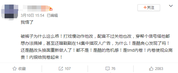 骂骂咧咧的点进去,一脸痴笑的看完,骂骂咧咧的关掉,估计是相当一部分观众的心声。