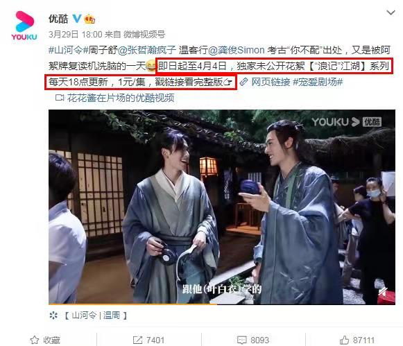 其实,对于优酷这次破天荒地让观众花钱看花絮的操作,除了是一次“割韭菜”行为,我更认为是平台在试探观众愿意为一部剧花钱的接受底线。毕竟,如今的平台,一直在开发新的收割观众钱包的套路。拿《山河令》来说,在播出之初,因为口碑爆棚,不少观众觉得优酷的更新方式太慢,一直“催更”。