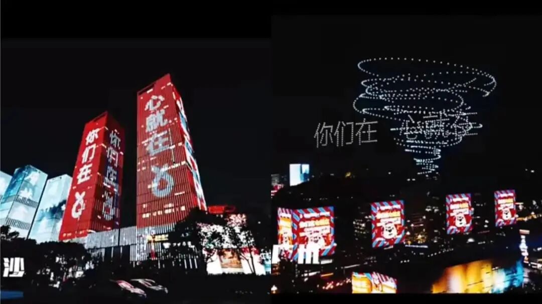 据了解,辛巴复播前斥巨资在广东、上海、沈阳、重庆、长春、武汉等多个城市的广告大屏频频“刷脸”,动用百台无人机摆出“你们在,心就在”的LOGO,买下高楼大厦的广告屏打出辛选的标志。