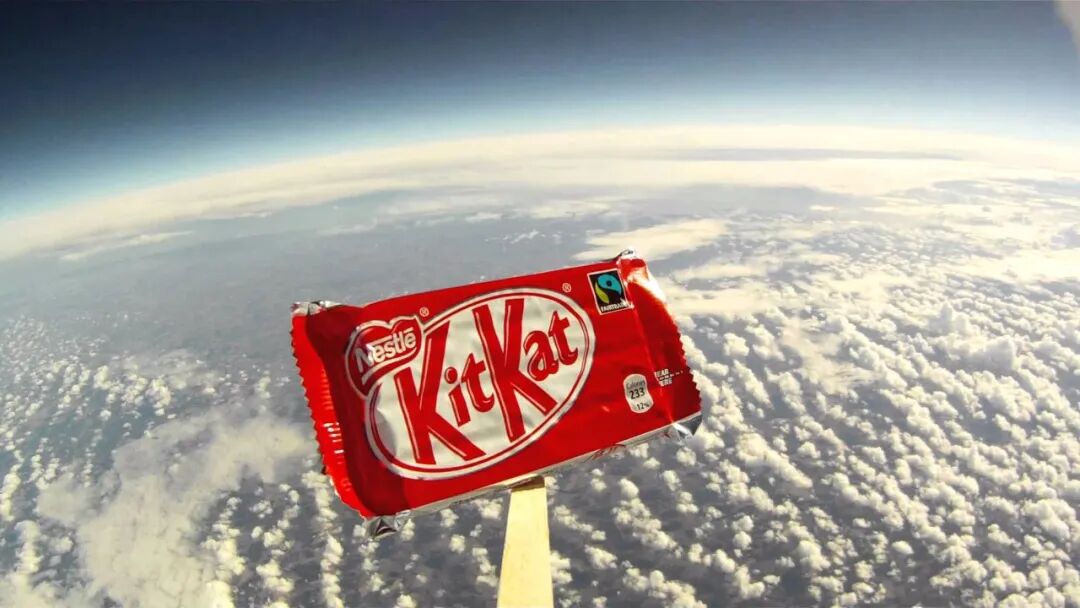 2012年,一块KitKat巧克力飞升至3万英尺的高空,为创下人类跳伞极限记录的菲利克斯加油打气。