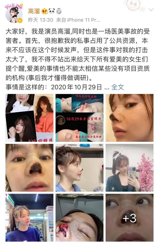 比如今年2月初,女演员高溜微博发长文,讲述了自己做医美鼻子整形失败的不幸遭遇,其术后不但没有变美,还出现排异、发炎,甚至坏死等症状。