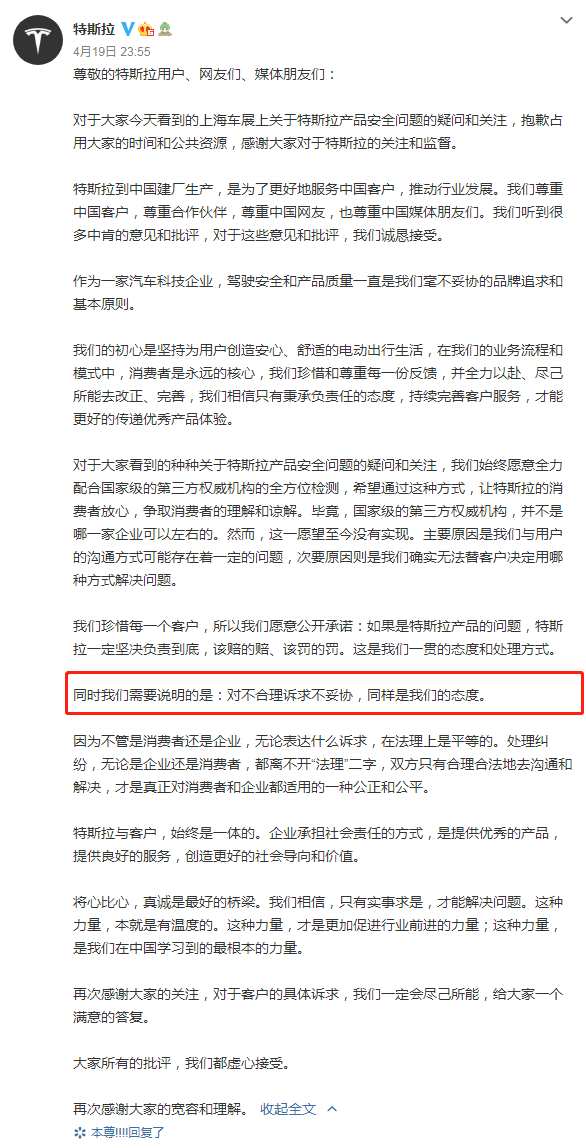 大概是这次回应并没有平息舆论,4月19日晚上,特斯拉又发了一篇声明。这一次,倒是能看出特斯拉想要处理问题的态度,但是一句“对不合理诉求不妥协,同样是我们的态度”还是让人感觉到特斯拉的傲慢。