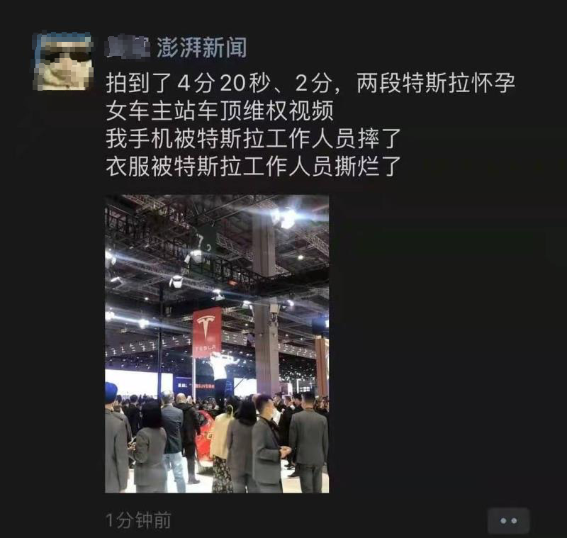 由于当天是国际车展的媒体日,现场不仅聚集了参观者,还有大量的媒体记者。女车主维权的视频和图片迅速就在抖音、微博等社交媒体刷屏了。这位维权的女车主也很快被工作人员“请”出了车展现场。这期间,车展现场一度非常混乱,有人大喊“打人了”,还有澎湃新闻的记者表示“手机被特斯拉工作人员摔了,衣服被特斯拉工作人员撕烂了”。而且,很快有网友认出,这位在车展维权的女车主是河南安阳的张女士。其实,她与特斯拉之间的博弈已经持续了近两个月。2月21日,张女士一家四口驾驶特斯拉Model 3出门游玩,遇到红绿灯要停车时,结果“刹车失灵”,追尾了两辆车,撞到了路边的水泥防护栏上。张女士找特斯拉维权,但特斯拉认为,出现交通事故的原因是驾驶员超速,刹车前车速为118km/h,并非刹车有问题。但张女士对此予以否认,她表示当时的实际车速约为60——70km/h。3月9日,张女士到特斯拉的4S店,坐在车顶上进行维权。公开视频中,我们可以看到白布黑字写着“特斯拉刹车失灵,造成严重事故”的条幅,张女士还手持喇叭播放“特斯拉Model 3春节期间刹车失灵,引发交通事故,一家四口险些丧命”的录音。4月初,在河南郑州大河车展的会场门口,张女士又雇了两位美女车模,向公众展示她的“刹车失灵”特斯拉,以此进行维权。