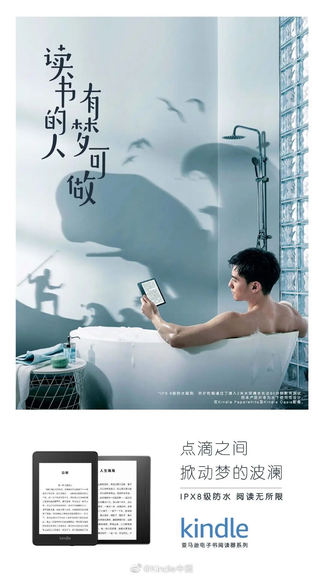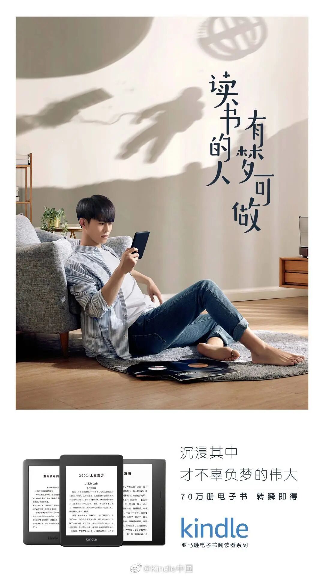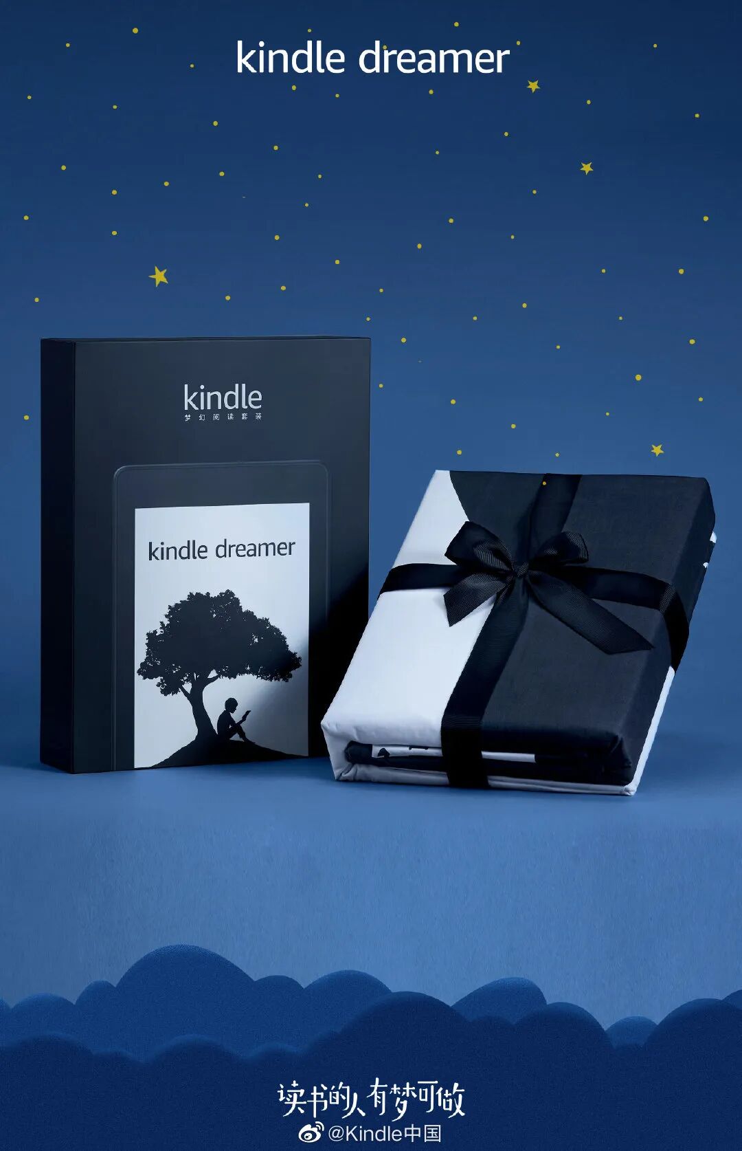 文案围绕「读书的人有梦可做」这一主题,凸显电子书阅读器轻薄、防水、海量库存和内置阅读灯四大卖点。这则海报最大的亮点,在于画面中墙壁的影子,呈现出来的「梦境」,与真实场景形成的鲜明的反差,展现读书带来的丰富想象力,完美诠释了「读书的人有梦可做」这一主题。如今蓝V联合成为品牌扩大传播矩阵的一种常规方式,借助不同品牌在垂直领域的影响力,实现双重赋能,扩大跨界联动矩阵。在这次的kindle「读书的人有梦可做」活动中,kindle也联合领英、戴尔、海尔、必胜客、猫王收音机、亚马逊海购等品牌,以“我想给梦加点xx”的句式,深化活动主题。比如和领英的联合海报文案为“我想给梦加点机会”,从职场的角度诠释梦想。和海尔的文案则为“我想给梦加点鲜活”,则是强调食材新鲜的重要性,凸显海尔冰箱保险的特点。通过与不同领域的品牌联动,不仅实现跨界资源整合,也从多方面深化传播主题,放大传播效果。为了让用户可以“全身心”沉浸在柔软的Kindle中,真正地做到#读书的人有梦可做#,”kindle还跨界卖起了四件套。