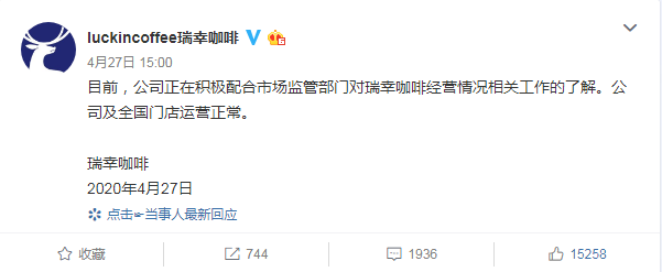 证监会调查组目前已经进驻瑞幸咖啡多日,公安、工商等部门进行了接管,全部数据被上交,所有高管都被盘查。当天下午,面对外界的强烈关注,瑞幸咖啡发布了官方消息:“目前,公司正在积极配合市场监管部门对瑞幸咖啡经营情况相关工作的了解。公司及全国门店运营正常。”