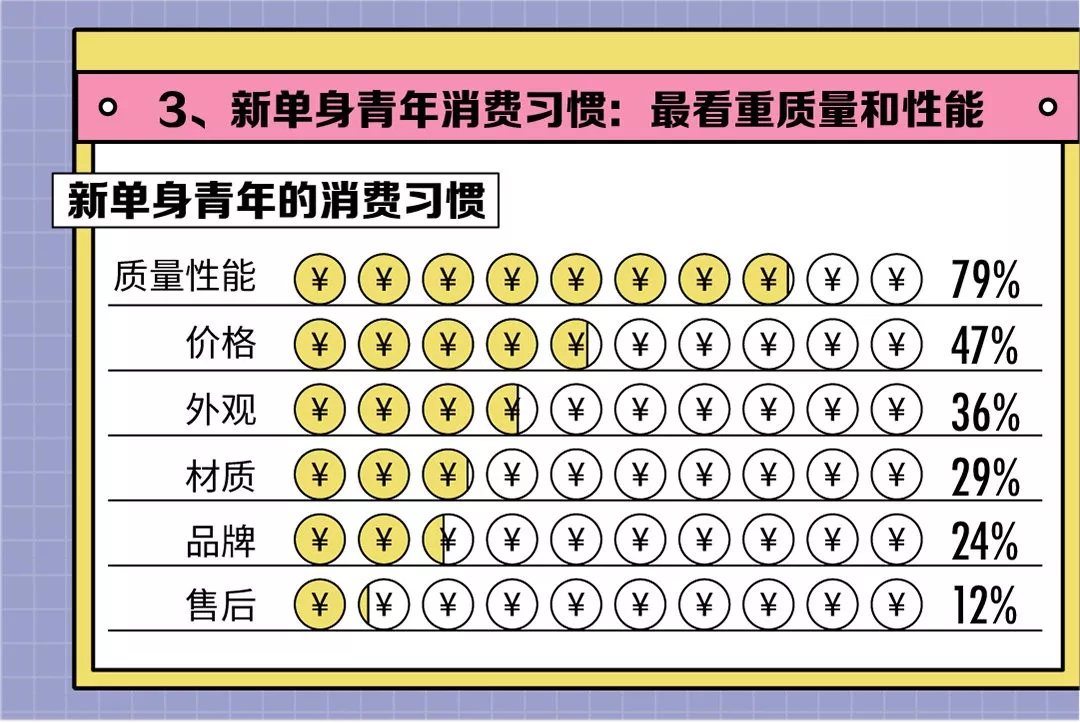 在消费习惯的分析中,质量与性能成为他们主要的消费考量因素,这个比例占到将近八成。而“价格”和“外观”也是新单身青年消费不可忽略的因素。