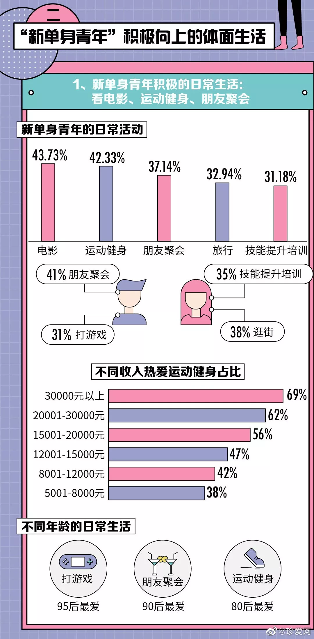 看电影、运动健身、朋友聚会成为“新单身青年”的体面生活的“三件套”。其中电影和运动健身的人群成为主要的“两座大山”。
