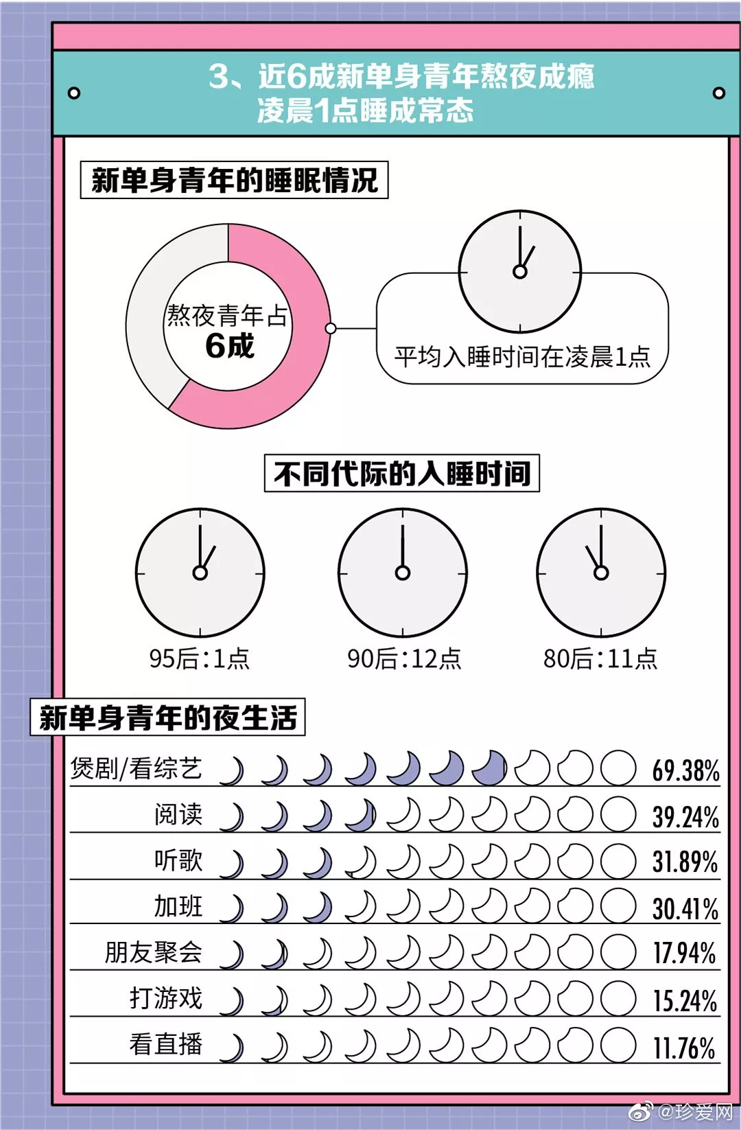 熬夜成为新单身青年的家常便饭,六成青年平均睡觉时间都是在凌晨1点钟。