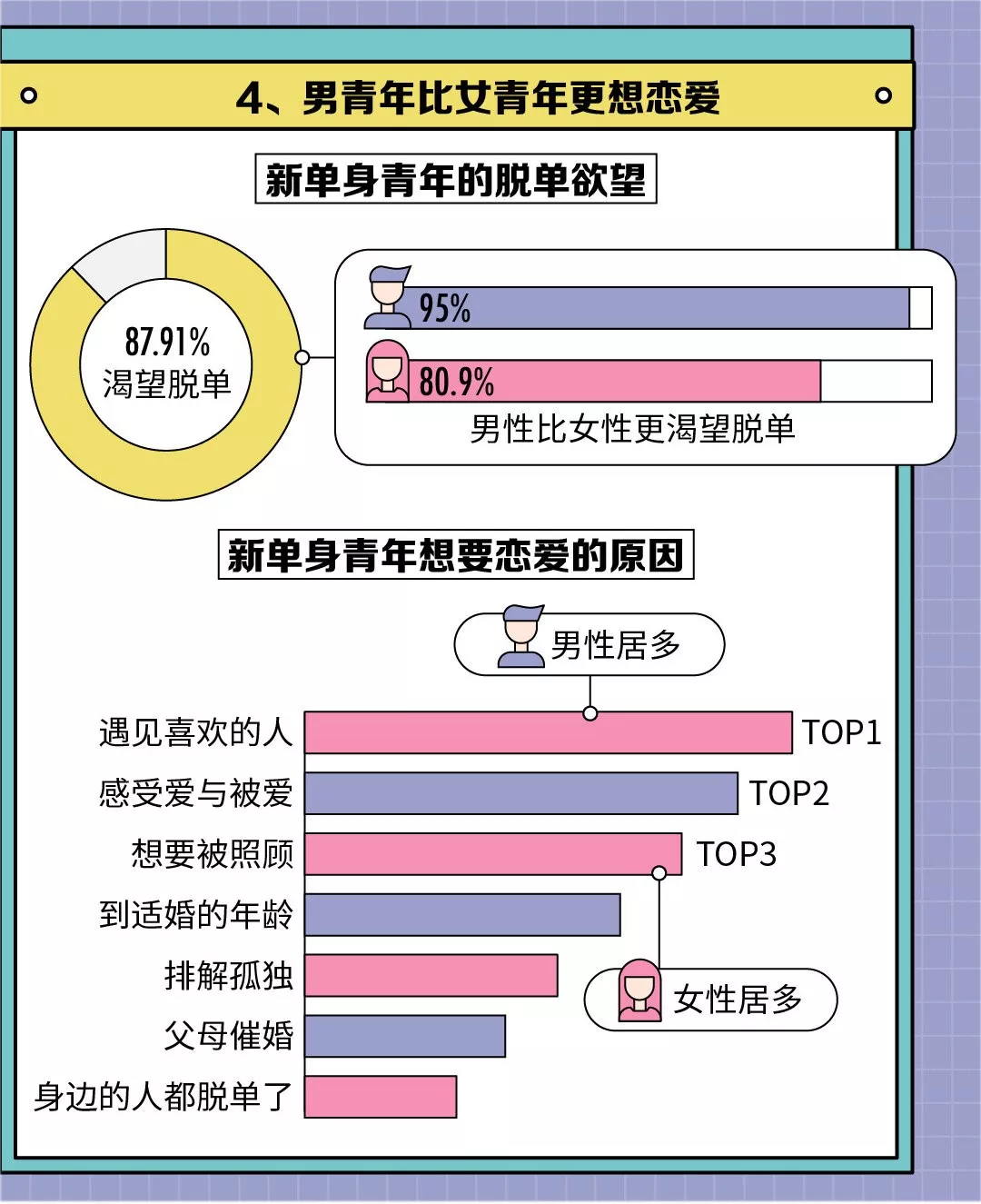 根据珍爱网报告分析,在渴望脱单的人群中,男性又比女性更渴望脱单。