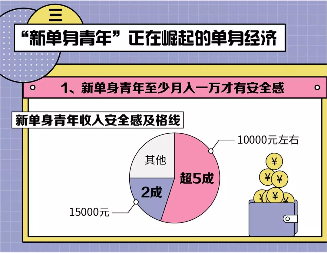 对于单身青年来说,收入至少一万才拥有安全感,还有两成的期望值更高,月入收入1.5万成为他们的收入底线。