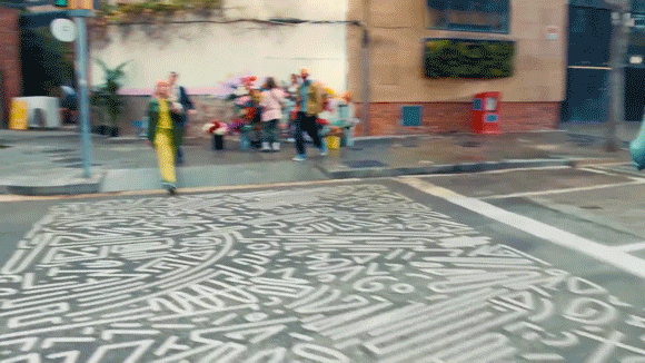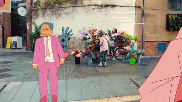 短片开头,由一个行人过马路开始,跟随他的脚步,城市实景街道也变得梦幻、有趣起来。地上的斑马线先是被魔棒工具变成透明图层,而后又被油漆桶工具刷成了街头涂鸦。随后镜头一转,迎面走来的路人与宠物猫,都被不同样式的笔刷工具涂成了动漫形象。走到路对面,有一个卖花小摊。一键调动色相饱和度功能,想要什么花色就有什么花色。一键启动抠图功能,想要多少鲜花就有多少鲜花。