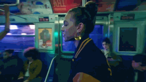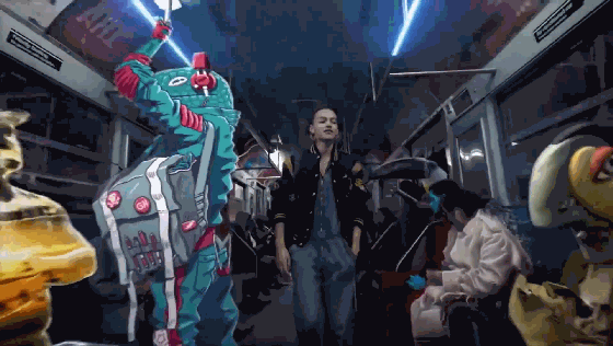 奇幻之旅开篇,主人公站在地铁中轻轻一跺脚,地板变成了我们熟悉的“透明通道”,并瞬间开满了鲜花。借着魔法棒,海报上的狗头,被P成了男乘客的新发型;油漆桶为旁边的便服女士,换上一套炫酷的套装;涂抹工具将发呆少女绘成了油画……总之,目光所到之处都是动画与现实的结合体。
