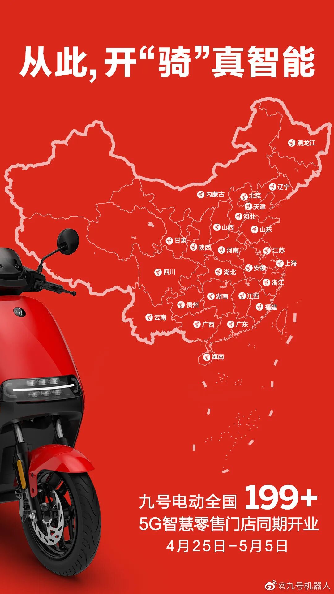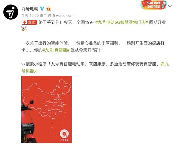 在新国标的契机下,智能电动车已经从产量的增长逐步让位于质的提高,市场的洗牌催生了巨大的机遇。九号电动车就是这一趋势下诞生的智能电动车“新物种”。继去年强势入局两轮电动车领域以来,九号电动车一直动作频频。据笔者了解,随着疫情的控制,全国电动车市场迎来复苏。借此,九号电动再次放出大招——首批100+城市的199+5G智慧零售门店已于4月25日同时开业,在破局智能出行行业之后,又在探索智慧零售新模式上迈出重要一步。不仅带来了智慧新零售的新体验,更给行业树立了新示范。