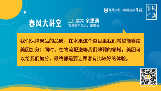 据了解,疫情冲击之下,不少商户积极寻求数字化自救之路,通过开展直播、线上化服务、上线美团安心系列服务等措施积极寻求自救,缓解疫情对经营的影响。为全面助力商户扩量增收,美团启动“春风行动”,百果园也参与其中,推出满减返券活动,刺激消费。余惠勇受邀参加的“春风大讲堂”直播课程活动,也是“春风行动”一部分。美团大学和中国企业家学院整合优势资源,通过“春风大讲堂”以鲜活案例传授实操技能,帮助生活服务业企业提升数字化能力。对于企业今年的发展,余惠勇充满信心。“逆势成长”,他在直播的最后给百果园定下了这样一个小目标。