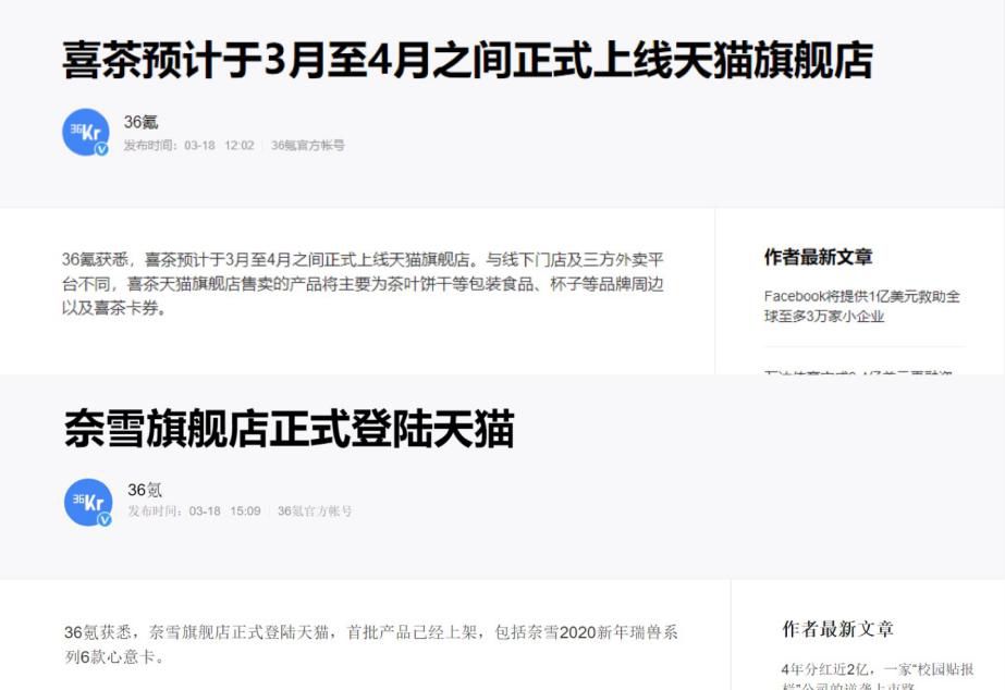 一条“喜茶预计于3月至4月之间正式上线天猫旗舰店”发布于3月18日中午12点,而另一条“奈雪旗舰店正式登陆天猫”发布于3月18日15点。同一媒体首发,前后仅隔3个小时,主角都是新式茶饮赛道中不容小觑的头部品牌。不同的是喜茶提前半个月预告了天猫店的上线时间,虽然暂时还没有产品上架,但好歹先“吆喝”起来,而奈雪则是正式“官宣”天猫旗舰店已经上线,首批上线的产品有16款茗茶及6款定制版心意卡,后续还会上架奈雪的冷泡茶、零食及品牌周边。两家品牌你争我赶地拓展天猫平台,足以看出新式茶饮数字化新零售赛场已经打响发令枪。