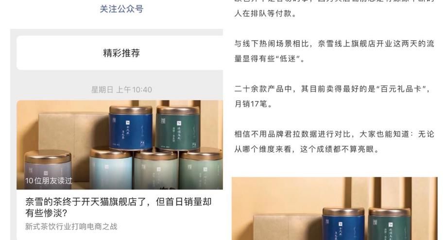 奈雪的茶作为新式茶饮头部品牌,颇具讨论度,行业纷纷表示或看好或观望。记者发现一个有趣的情况。在奈雪旗舰店上线仅三四天便已经有营销类文章,将奈雪旗舰店单品类产品的首日订单数冠以“月销量”之名,意图表述“奈雪旗舰店流量‘低迷’”。这显然与记者了解到的数据大相径庭,不过也侧面印证了新式茶饮赛道竞争果然激烈。