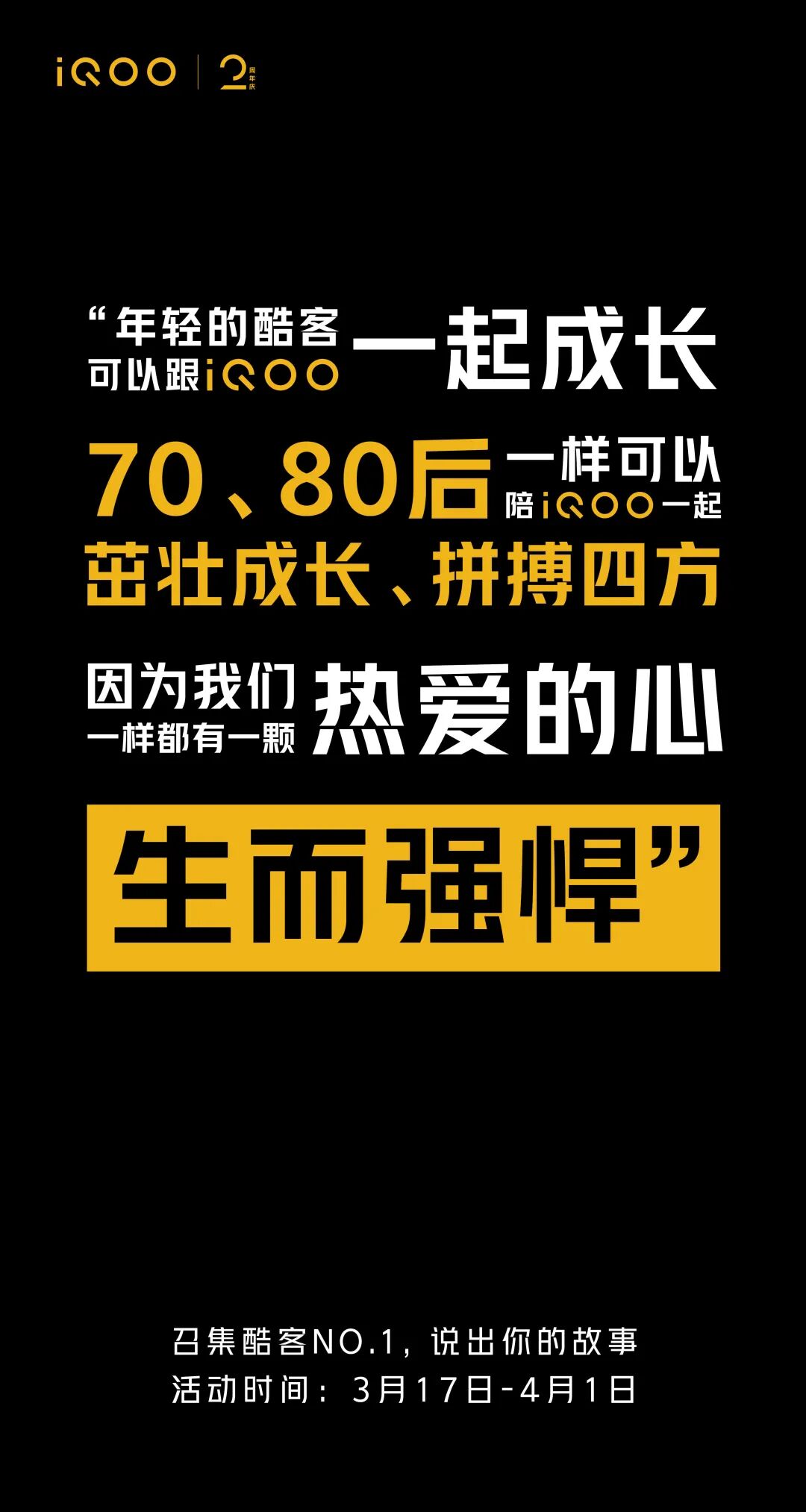 在这一点上,最近我就留意到iQOO一场两周年庆营销,在自己的主场做起了配角,居然让酷客当起了主角。iQOO为了回馈酷客2年的陪伴,一起回顾 iQOO 2 年间的点滴,打造“一起强悍到底”的周年庆主题活动,将粉丝营销玩出新花样,给我们示范如何跟粉丝共情、共创和共享。