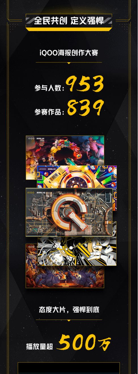值得一提的是,为了强化品牌与酷客们的互动粘性,iQOO发起“酷客文创大赛”,联合站酷网以“Q的强悍定义”为主题,推出创意海报设计大赛,前后吸引将近1000人报名,参赛作品逾800件。