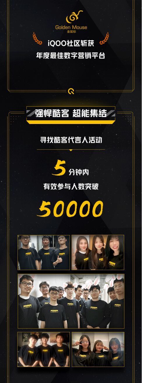 从3月开始,iQOO推出“酷客生日宴”,开启全国8+城市欢聚活动,有效激活酷客群体的活跃度,提升酷客对品牌的归属感;同时线上发起“寻找50000酷客代言人”的H5庆生活动,作为一种“0门槛+高福利+组团”的互动机制,iQOO拿出十足诚意做互动,为活动准备丰厚福利——包括T恤、棒球帽、挎包等品牌周边、iQOO 2021年全年发布的新品手机。