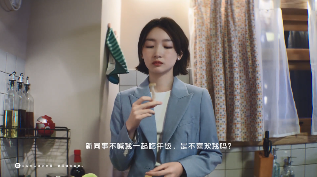 房价的高涨,繁忙的工作致使许多年轻人成为了“不婚族”。单身经济崛起,一人食成为新的消费趋势,独居、独饮,却也乐在其中。由于女性在职场上的压力大,郁闷心情无处排挤,大多数人可能会选择一款适合自己的酒。小酒微醺,释放心灵,更好地抒发情绪。洞察到这一现象,RIO微醺挖掘女性消费者情感需求,于是拍了这样一支片子,来与消费者沟通。在RIO微醺这支短片中,不到两分钟,切换了四个场景,一罐RIO微醺就将女主的爱情、职场、亲情、友情上的生活串联起来,每一段场景故事都无比贴近我们的生活,让人产生很强的代入感,那些难以吐露的小心事,就着小酒下肚。暗恋一个人是什么感觉呢?会关注TA的一举一动,会在日常中寻找各种“巧合”,就像短片中的周冬雨,偶然发现暗恋的他竟然和自己喜欢同一首歌,觉得这就是缘分,尽管是微不足道的小事,但是却足以让人开心一整天。新工作入职最担心的是不能融入集体,不被新同事接纳,短片中周冬雨因中午吃饭时新同事没有喊她而心情郁闷,怀疑新同事是不是不喜欢自己,这种低落的情绪,只有饮一杯RIO来化解。独自一人在外,许多人都习惯对父母报喜不报忧,面对妈妈无时无刻的关心,该如何让她安心呢?短片中的周冬雨即使晚饭只是一罐RIO,也会安慰父母自己已经吃过晚饭了,为的就是不让妈妈担心,这样的情况想必很多在外打拼的人都深有同感。闺蜜,就是无话不谈的朋友,偶然发现闺蜜和别人出去玩竟没有叫自己,会怀疑“我还是不是她最好的朋友?”,但是当那行质问的文字还未发送出去时,还是会默默删了,因为闺蜜也是亲密有间的。这四种有小心事的场景,情绪无处倾诉,是最容易想要来一瓶RIO微醺的时刻,RIO正是洞察到了女生这一情感层面的需求,以场景化的故事来勾起人们的消费需求。每个小故事的标题以「xxx那些微不足道的小事 微醺知道」为固定句式,从这句文案可以看出,短片给微醺的定位就像一位会倾听自己、懂得自己的「知己」,那些关于爱情、职场、亲情、友情里不便说出口的小心事,微醺都知道。通过这种品牌人设的打造,将RIO微醺酒打造为精神产物,使产品上升到了“懂自己的心灵伴侣”这一精神层面的沟通。它丰富了“一个人的小酒”的场景,更对应了多种社会情绪。02