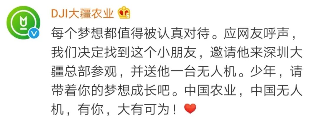 与此同时,大疆两个官方账号也在第一时间转发微博,表达了品牌态度,表示会邀请小男孩到深圳大疆总部参观,并送他一台无人机。
