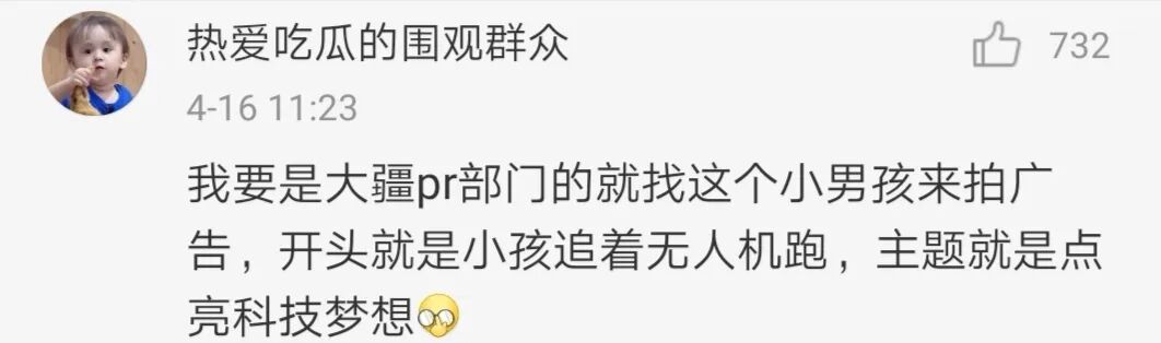 而有网友则为大疆提出了进一步的营销方案:找小男孩拍广告,主题是点亮科技梦想。
