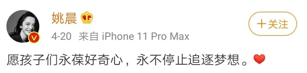 姚晨转发了相关微博,并配文:愿孩子们永葆好奇心,永不停止追逐梦想。