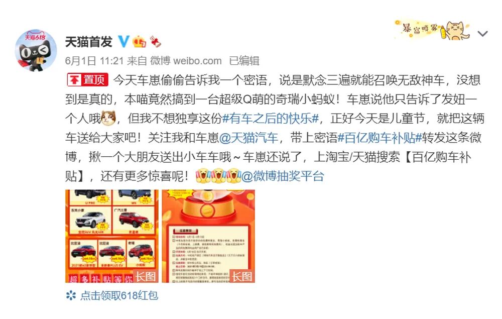 站在B端的角度来看,天猫汽车依托于自身在流量、数据、资源等的优势,通过线上直播、短视频、双微等线上场景,为品牌们获得增加曝光度,实现用户拉新,打破汽车品牌营销的天花板。另外,天猫汽车发挥平台年轻化破圈资源,如线上618超级会场、品牌任务、天猫补贴、线下特技大赏活动等优势,以年轻人喜闻乐见的方式营销,助力品牌商圈粉年轻人;此外,根据阿里巴巴大数据能力,天猫通过汽车品牌天猫旗舰店及一系列平台工具的运用,缩短品牌的营销路径,大大降低品牌直接触达消费者的成本,也提高了营销的精准性。从C端的影响力来看,天猫汽车围绕“上天猫买车,百亿补贴折上折”话题,打出一套营销组合拳,不止于办一场汽车品牌商安利会,更是在办一场与粉丝共high的趴体,成功走近年轻人:以social感十足的社媒话题为传播支点,借力明星/KOL的号召力,整合沙雕tvc、明星宠粉、知识营销、场景营销等多元玩法,联动喜马拉雅、双微、知乎、豆瓣多平台,打造全触点、全链路、全人群的生态,实现用户心智在细分场景下的全域触达。对于天猫汽车自身而言,可以说完成“上天猫买车”的心智高地绑定,抢先竞品饱和打击并反复固化品牌印象,为618大节开了一个好头。
