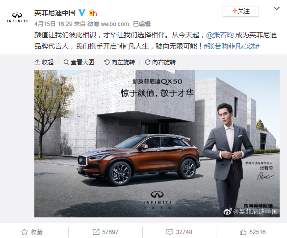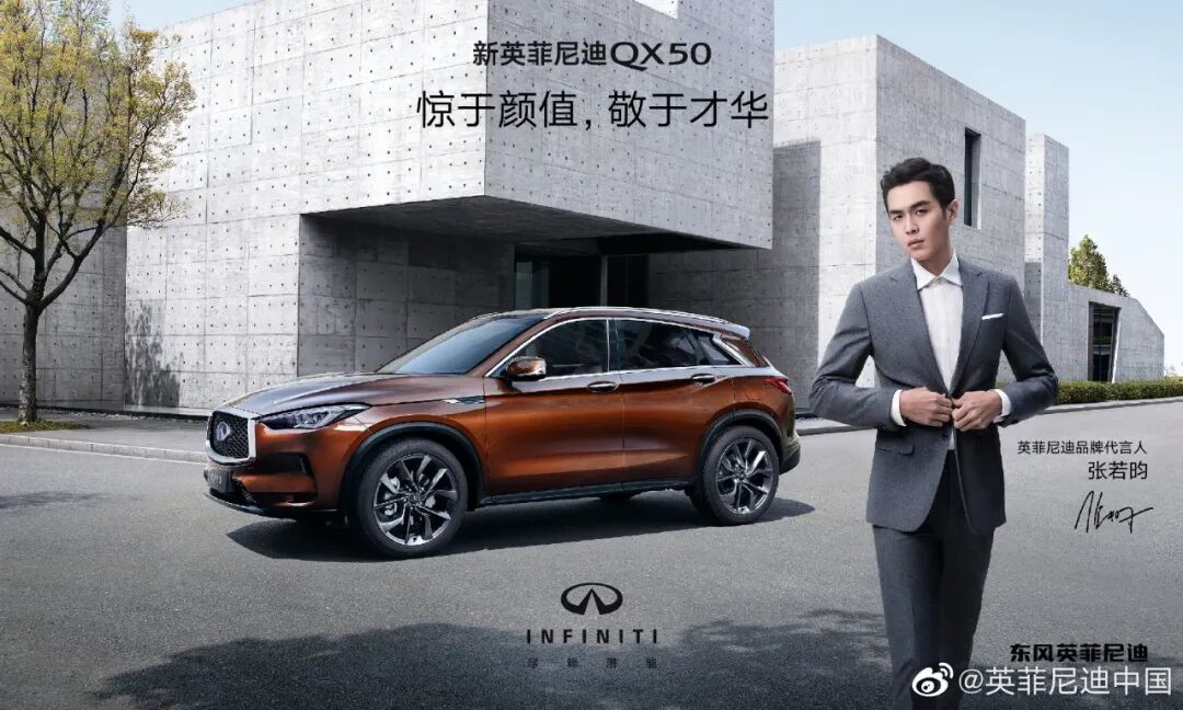 4月15日,英菲尼迪官宣了张若昀成为品牌代言人。官方用的文案是“颜值让我们彼此相识,才华让我们选择相伴”。