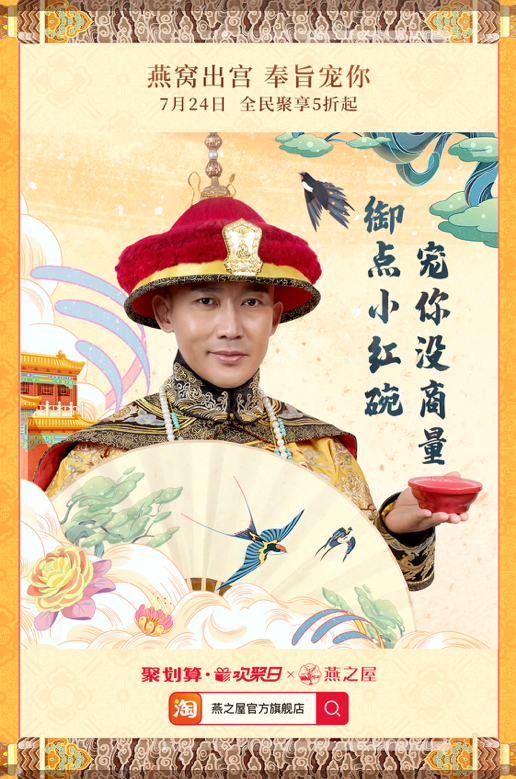 而在国潮复兴的趋势下,燕之屋更是积极走在行业前列,2019年,燕之屋邀请在《延禧攻略》中饰演乾隆皇帝的演员聂远,发起一场《乾隆南巡携燕窝出宫,奉旨宠你!》的线下趣味营销,融合明清宫廷文化、圣旨、乾隆传说等元素,带领消费者穿越时空感受宫廷燕窝。